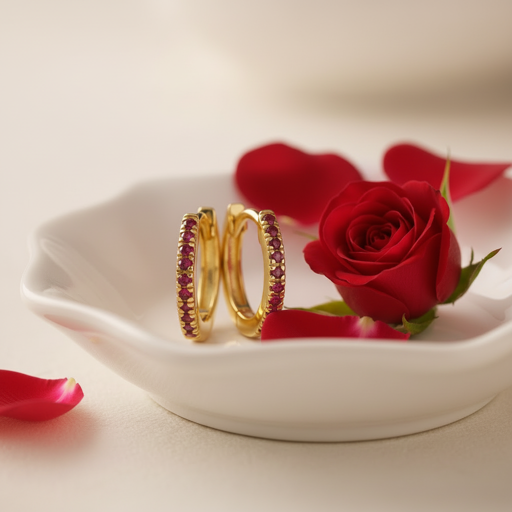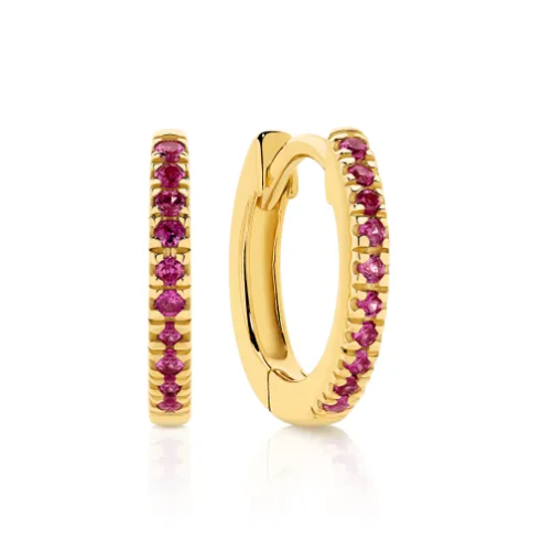 Delicate 9ct yellow gold huggies crafted for the discerning jewellery collector. These petite earrings measure approximately 12mm across and showcase twenty round pink sapphires set with precision. Their refined proportions make them ideal for stacking in a second piercing, offering versatility without compromising elegance. A sophisticated addition to any curated ear stack.